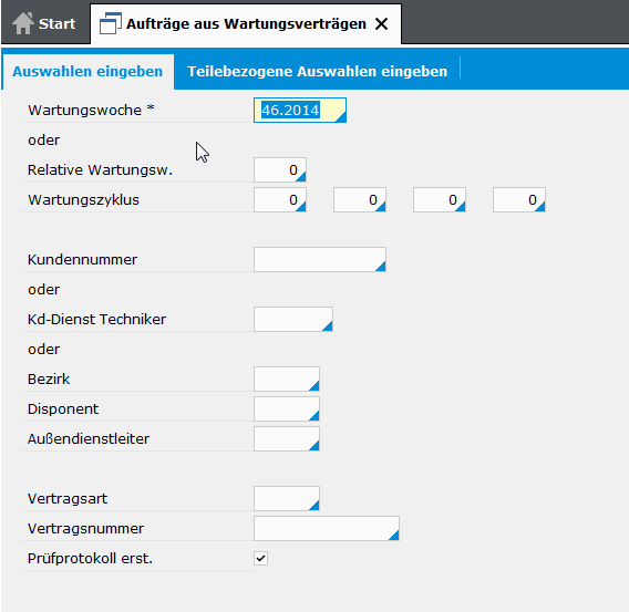 In regelmäßigen Abständen wird das Programm SA20120R zur Erstellung der Wartungsaufträge gestartet. Die betroffenen Wartungsverträge können hierbei nach verschiedenen Kriterien ausgewählt werden: