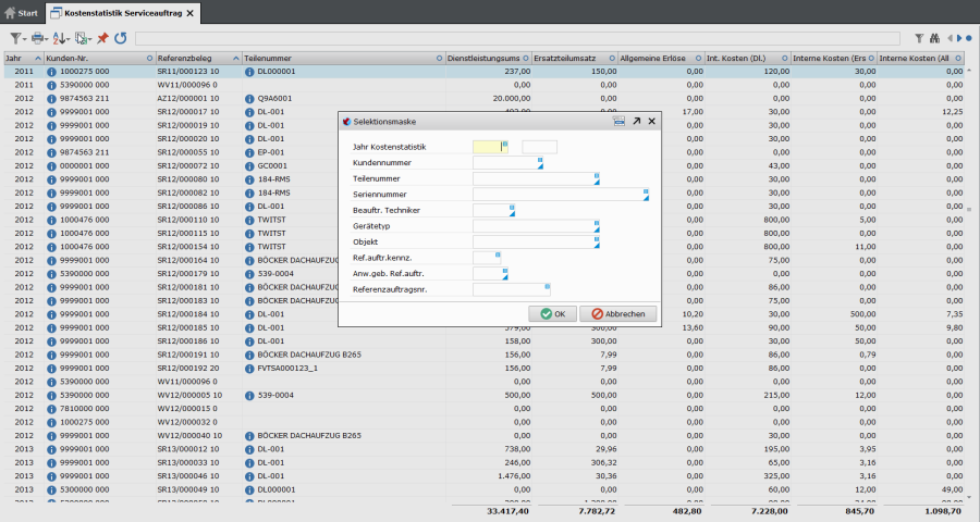 Auftragsrechnungen, die erfolgreich in die Finanzbuchhaltung übergeben worden sind, können über eine Kostenstatistik nachträglich ausgewertet werden. Diese Kostenstatistik ersetzt nicht das Kostenrechnungsmodul, soll aber dem jeweiligen Verantwortlichen im Servicebereich einen kurzen Überblick über die aufgelaufenen Kosten und Umsätze geben können.