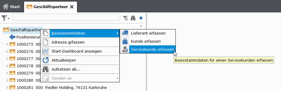 Soll ein Auftrag für einen Kunden erfasst werden, der noch nicht im System registriert ist, so kann über die Verwaltung Geschäftspartner die Adresse sowie der Servicekundenstamm und das zugehörige Personenkonto angelegt werden.