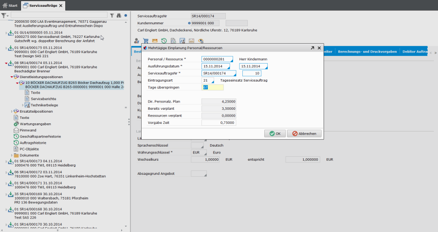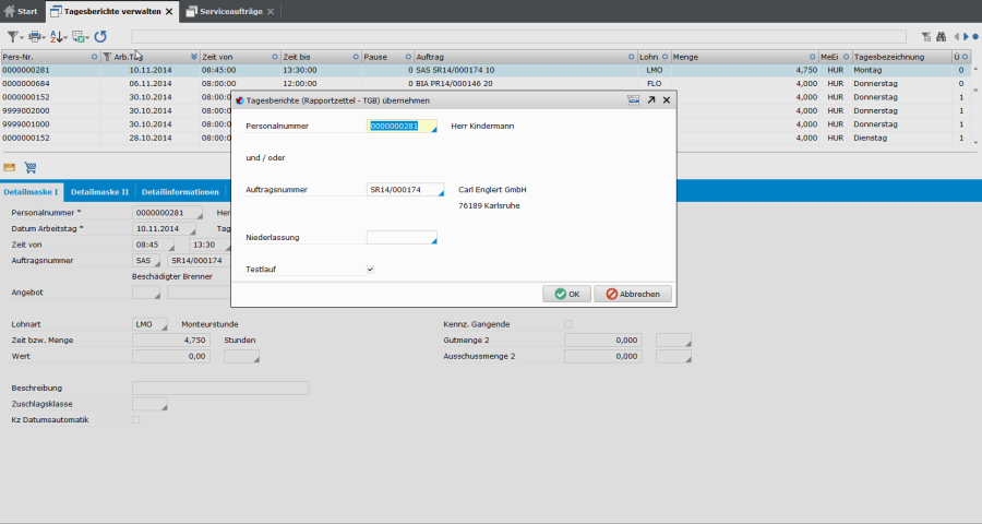Bei tagesgenauer Abrechnung (Angabe im Auftragskopf - Leistungsnachweis = je Personalnummer/Lohnart/Tag) wird als Leistungsdatum für die Rechnung das Bis-Ausführungsdatum (wenn gefüllt - manuelle Eingabe) herangezogen. Ist nur das Ausführungsdatum gefüllt (Pflichteingabe), dann wird dieses als Leistungsdatum für die Rechnung herangezogen. Gibt es mehrere Technikerbelegköpfe wird jeweils das jüngste Datum als Leistungsdatum in der Rechnung verwendet.