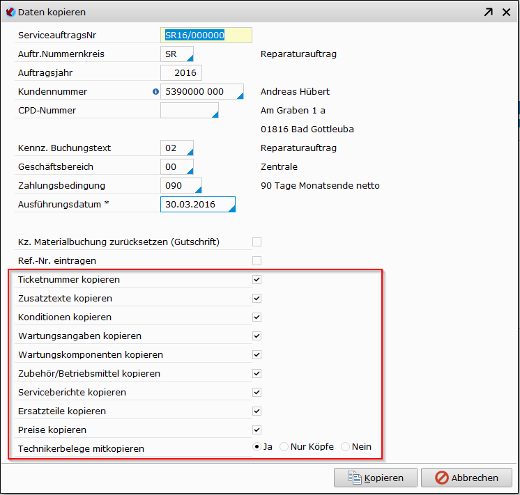 - Es kann wahlfrei entschieden werden, welche Bereiche in den zu kopierenden Auftrag übernommen werden sollen (Die kopierbaren Belegelemente sind rot markiert )