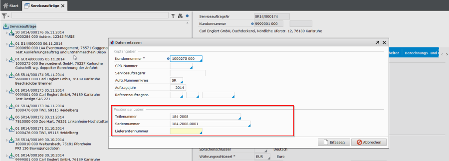 Im Rahmen der Auftragsverwaltung können bei Dienstleistungspositionen Seriennummern zur Dokumentation registriert werden.