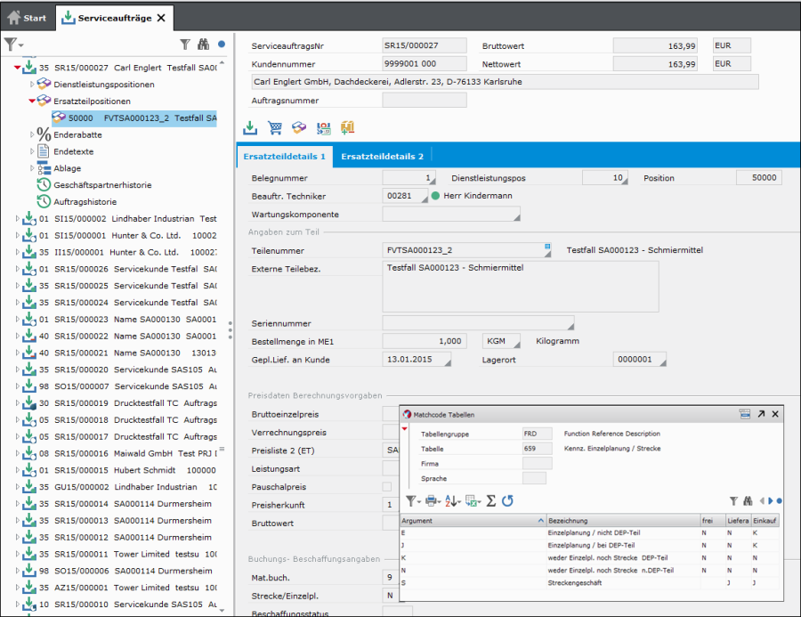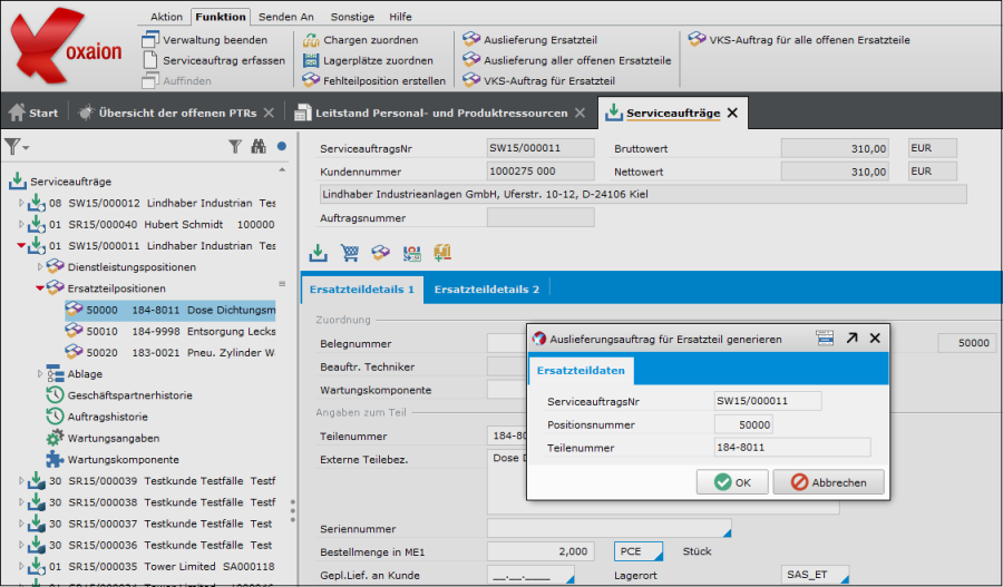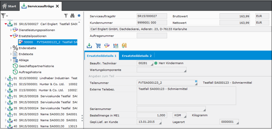 Im Serviceauftrag wird das Ersatzteil der Dienstleistungsposition direkt zugeordnet