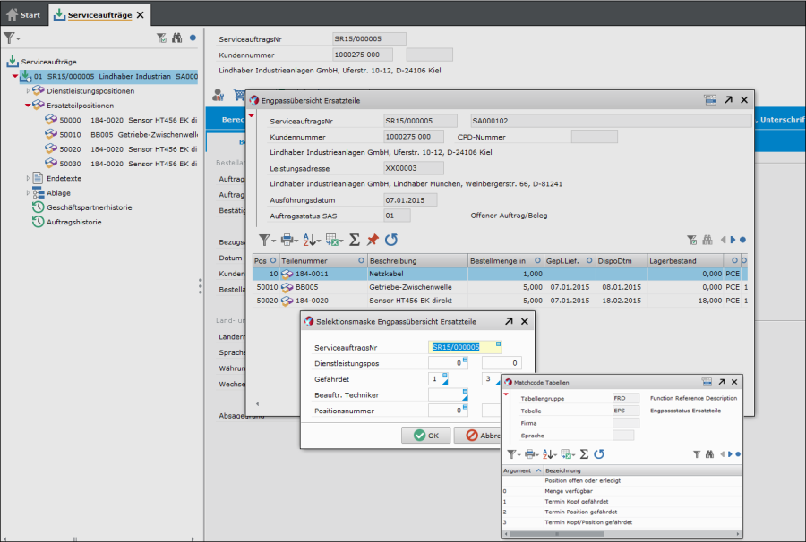 Ersatzteile werden im Serviceauftrag angelegt. Informationen zur Bestandssituation und Dispositionsübersicht stehen über das Auskunftssystem Lager und die Verfügbarkeitsprüfung pro Teil zur Verfügung.