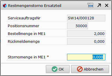 Der Restmengenstorno von Ersatzteilen wird über das Kontextmenü in der Ersatzteilposition des Serviceauftrags ausgesprochen.