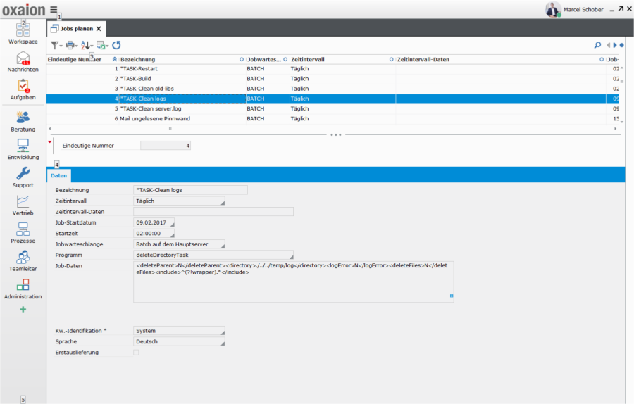 Das Programm „Jobs verwalten" (US00310R) kann entweder über die Befehlszeile oder den persönlichen Workspace (siehe Administrationsaufgaben vorbereiten) aufgerufen werden. Es erlaubt die Konfiguration periodisch auszuführender Jobs.