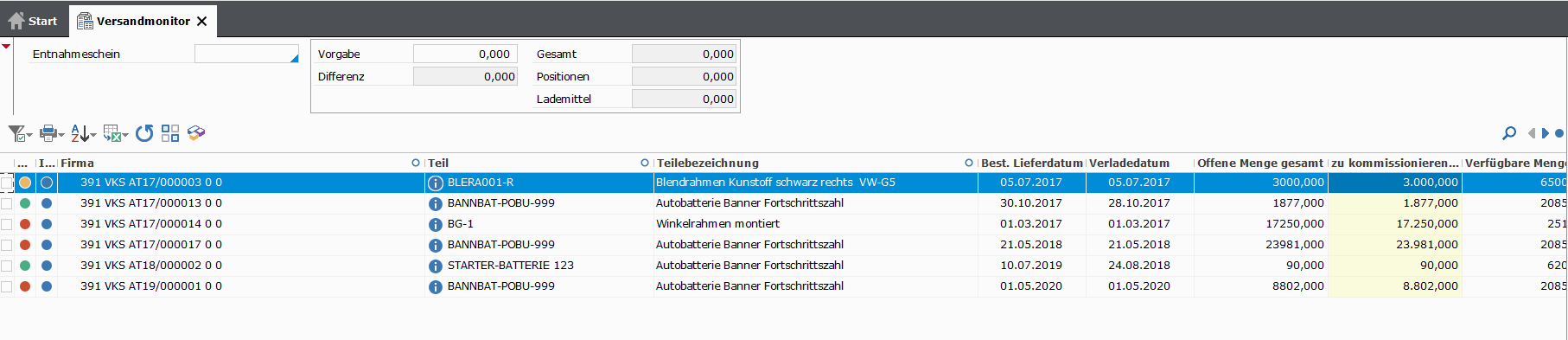 | Beschreibung Verfügbarkeit | Grün | Menge verfügbar (bei Teilen mit Bestandsführung inkl. Packmittel auch unter Berücksichtigung einer evtl. vorhandenen Packmittelvorschrift). |