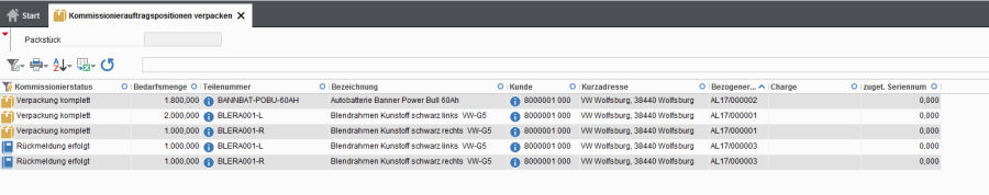 - Anschließend werden die Positionen des Kommissionierauftrags aufgelistet und können rückgemeldet werden.