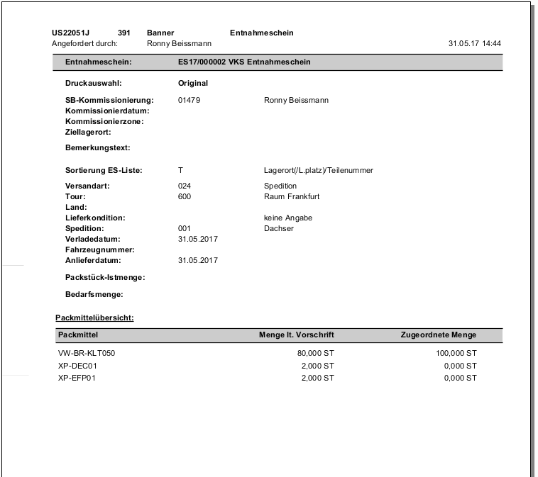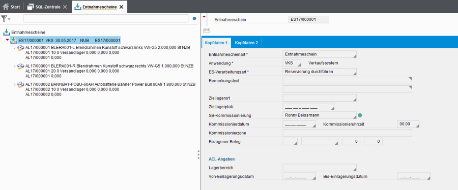 - Entnahmescheine (ES) werden für die Abwicklung von Materialtransaktionen (Aus-, Umlagerungen und Entnahmen) aus den verschiedenen Anwendungsgebieten (Einkauf, Vertrieb, Produktion, Lager) herangezogen.