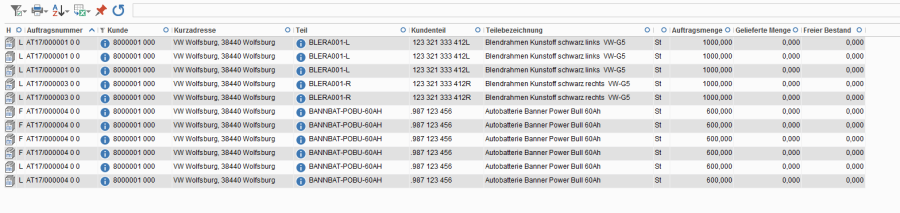 - Der Kopf enthält neben allgemeinen Daten zum Kunden, Teil und Abschlussvereinbarungen auch steuernde Angaben für die Disposition, den Versand und die Fakturierung.