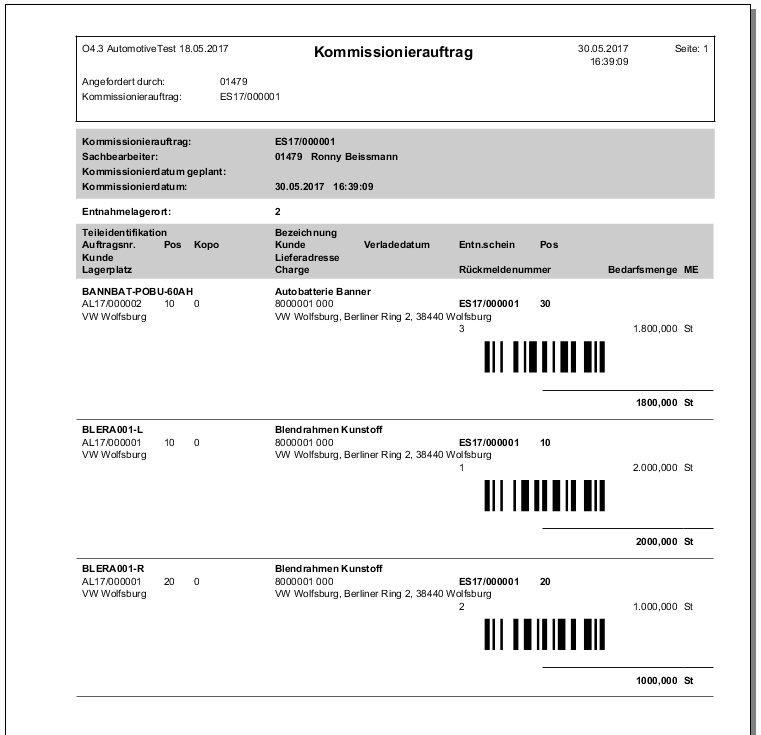 Hinweis: über das Kontextmenü ES-Positionen zu Kommissionieraufträge generieren wird ein Kommissionierauftrag erstellt.