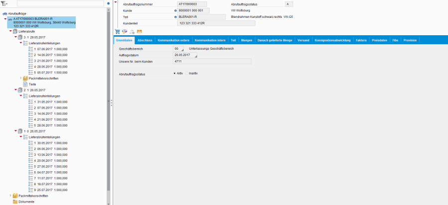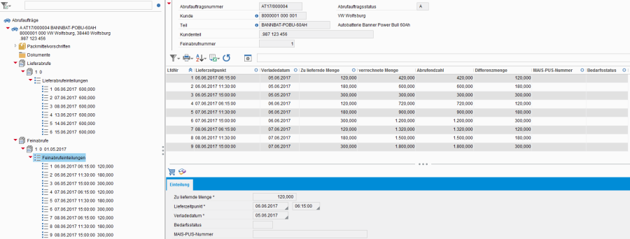 - Die Liefer- & Feinabrufe beinhalten die Einteilungen mit den zu liefernden Mengen und Terminen. Diese Daten werden in der Regel per EDI vom Kunden übermittelt, können aber bei Bedarf auch manuell erfasst bzw. bearbeitet werden.