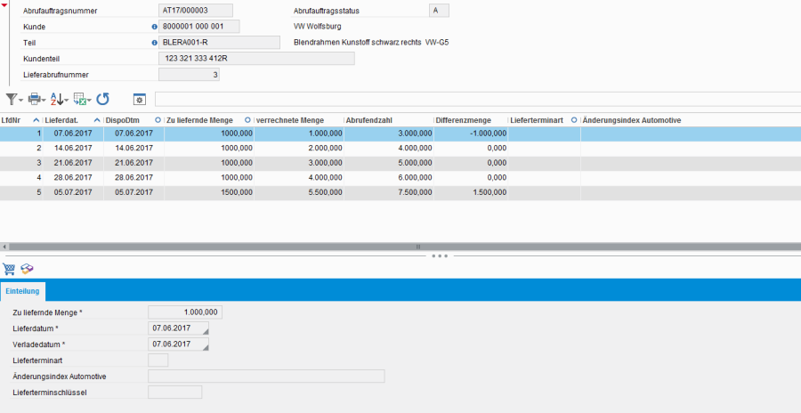 In unserem Beispiel können wir erkennen, dass dieser Abrufauftrag (AT17/000003) bereits 3 Lieferabrufe besitzt. Im Vergleich vom höchsten (LA: 3) zum Vorgänger (LA: 2) ist hier bei den Lieferabrufeinteilungen ein Datum weggefallen (ausgeliefert), dafür ein neues Datum/Menge dazugekommen.