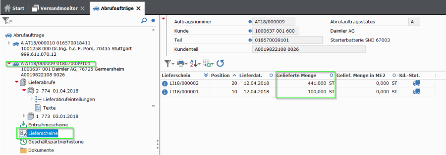 Ausgehend vom Versandmonitor über Entnahmescheine, Ladescheine und abschließend Lieferscheine wurden hier bereits 2 Auslieferungen vorgenommen.