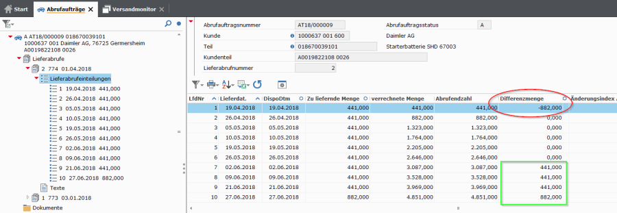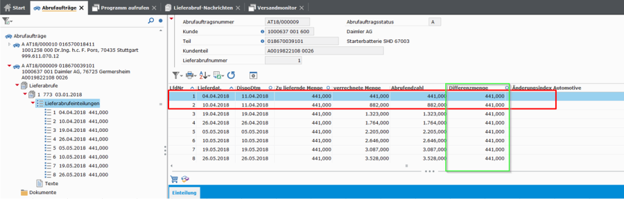 Bei der Betrachtung der Tabellenspalte „Differenzmenge" (grün markiert) sind die jeweils zum vorangegangenen Lieferabruf geänderten Mengen ersichtlich.